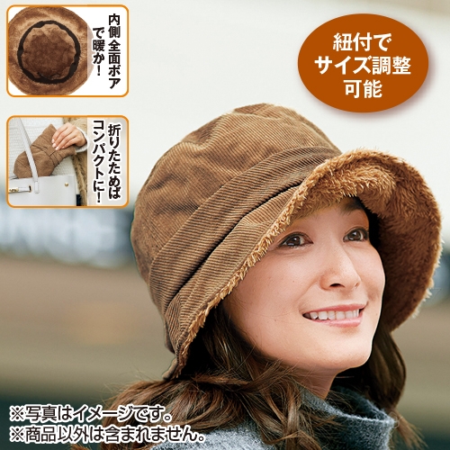 内側は全面ボア製のあったか帽子。コンパクトに折りたためるのでバッグに入れてもかさばりません。