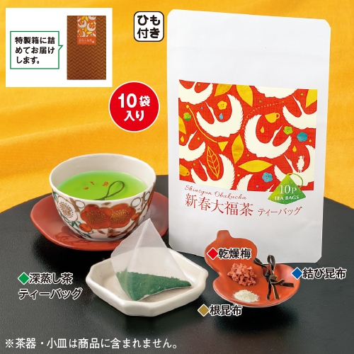 元日の朝一番に飲むことで、病気や邪気を払い、長寿幸福を得られるとされる大福茶。お茶に梅干と結び昆布が入っており、梅干は「しわが寄るまで」と長寿健康を願うもの。結び昆布は「睦みよろこぶ」と家族の輪を願うものとされています。そこで今回、乾燥梅、結び昆布、根昆布を健康成分豊富な深蒸し茶ティーバッグ10袋とセットしました。新年にご家族で飲んで、一年の平穏無事をお祈りください。