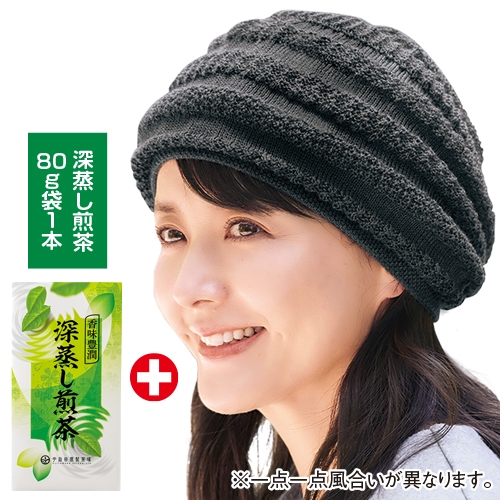 内容 | ●深蒸し煎茶80g袋1本 ●帽子1個(頭囲約56~59cm/毛・アクリル・絹) |