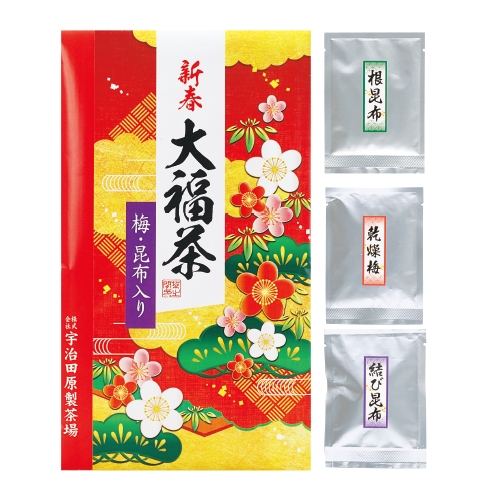 | 内容 | ●<大福茶>70g袋 ●凍結乾燥梅肉10g ●結び昆布10本 ●昆布茶10g ●たとう紙巻(箱には入れずお届け) ●235×135mm |