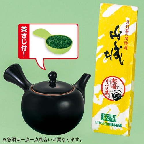 | 内容 | ●熱湯かぶせ茶<山城>100g袋1本 ●急須1個(約300cc/帯網/陶器) ●茶さじ1個(長さ約7.9cm/樹脂) |