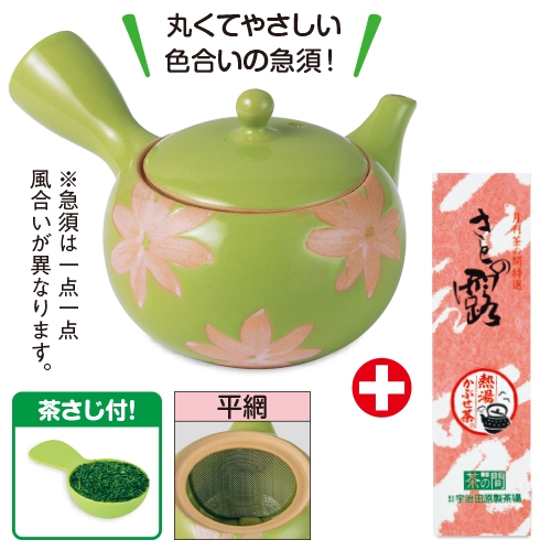 | 内容 | ●熱湯かぶせ茶<さとの露>100g袋1本 ●急須1個(約290cc/平網/陶器) ●茶さじ1個(長さ約7.9cm/樹脂) |