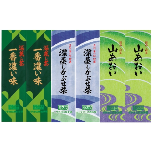 | 内容 | ●<一番濃い味深蒸し茶>100g袋2本(3456円) ●<深蒸しかぶせ茶>100g袋2本(2808円) ●深蒸し煎茶<山あおい>100g袋2本(3240円) |