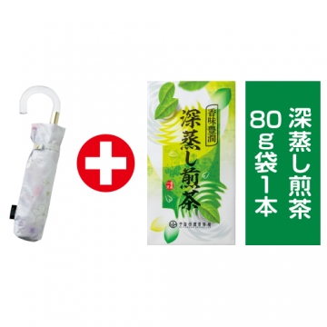 | 内容 | ●深蒸し煎茶80g袋1本 ●傘1本(折畳時約33cm<収納袋含む>/親骨約55cm/約230g/ポリエステル) |