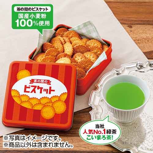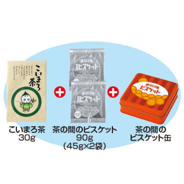 | 内容 | ●こいまろ茶30g袋1本 ●茶の間のビスケット90g(45g×2袋/賞味期間150日) ●特製缶(122×122×42mm) |