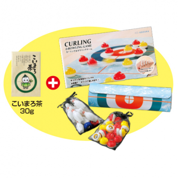 | 内容 | ●こいまろ茶30g袋1本 ●カーリング&ボーリングセット1個(プレイマット1枚〈90×25cm〉/カーリングストーン16個〈赤・黄各8個〉/ボウリングボール2個〈赤・青各1個〉・ボウリングピン10本/ポリエステル・ゴム・ABS樹脂・鉄/収納袋2個付) |