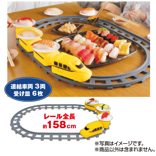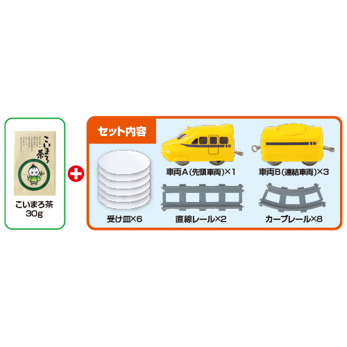 | 内容 | ●こいまろ茶30g袋1本 ●回転寿司トレイン1個(レール内径63×44cm/車両×4/直線レール×2/カーブレール×8/受け皿×6/ABS樹脂) |