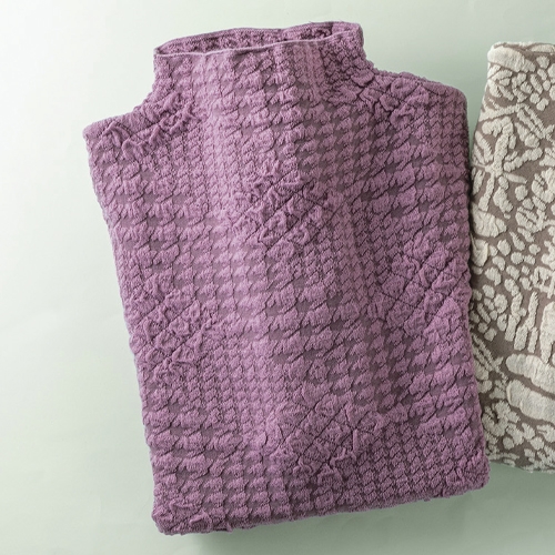 ゆったり伸びるから、肌触りも脱ぎ着もストレスフリー。袋編みで空気を含んでふんわりあったか!立体的で上品なデザインです。