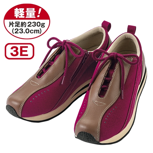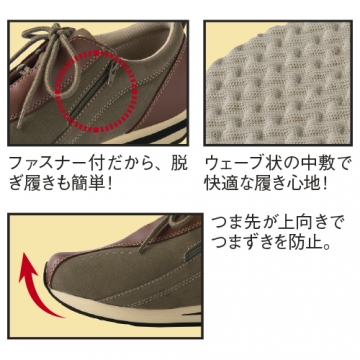 衝撃を吸収する底材を使った、軽量で歩きやすいタウンシューズです。サイドファスナー付で着脱も簡単!