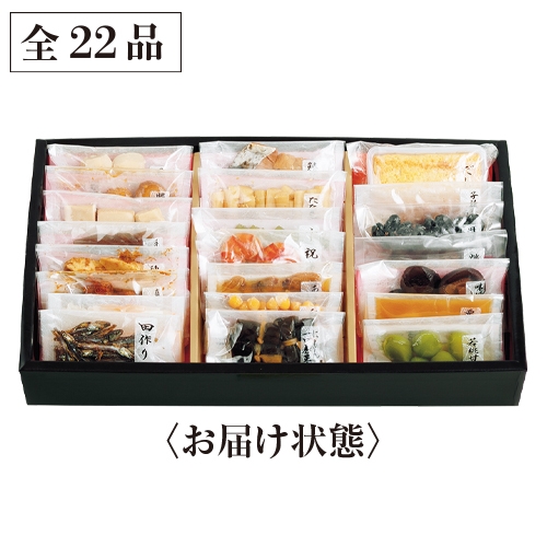 | 内容 | ●おせち料理(パック詰)22品 ●賞味期限:1月31日(開封後は冷蔵庫に保管しお早めにお召し上がりください) |