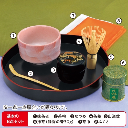 風情ある山道盆や桜色の美濃焼抹茶碗をはじめ、お点前に必要な茶道具一式と旨み豊かな〈静香の昔〉の抹茶缶を特別価格でご用意。盆上でお点前が気軽に始められて、これから茶道を嗜みたい方におすすめのセットです。