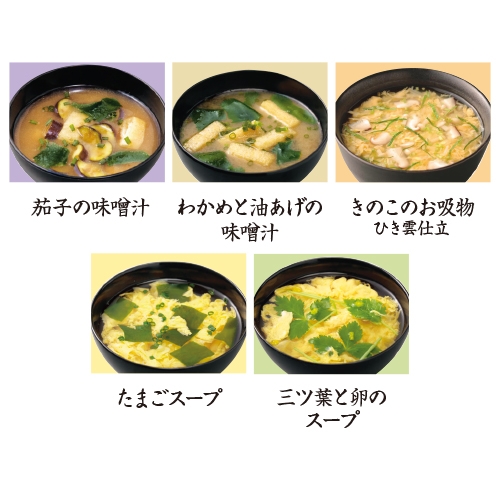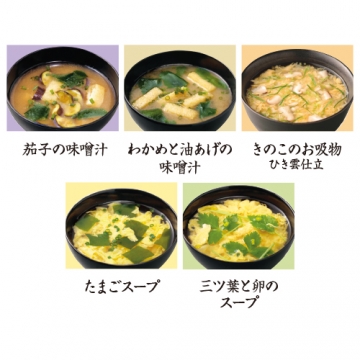 | 内容 | ●味噌汁2種各5個 ●スープ2種各5個 ●吸物5個 |