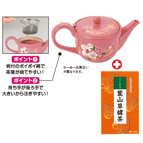 | 内容 | ●ブレンド健康茶<鷲山草健茶>100g箱1本 ●急須1個(約240cc/柄付かご網/陶器) |