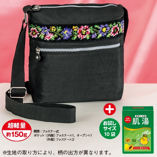 | 内容 | ●薬用入浴剤10袋(1袋20g入/医薬部外品) ●バッグ1個(袋部分:約タテ25×ヨコ25×マチ4.5cm/肩ひも最長約130cm/ナイロン・ポリエステル・綿) |