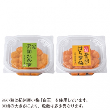 | 内容 | ●梅干<小粒茶の間のお茶事>(塩分約6%)・<小粒茶の間のはち蜜梅>(塩分約4%)各100g ●賞味期間180日 ●紀州産 ●包装有 |