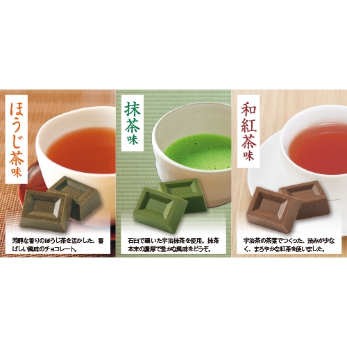 宇治の茶畑で育った茶葉を使った3種のチョコレート。とろりとなめらかに口の中でとけ、お茶の豊かな風味が広がります。3種のバラエティ豊かなおいしさをお楽しみください。