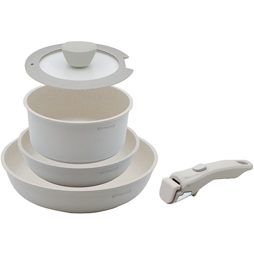 | 内容 | ●フライパン(大)1個(約内径26×深さ5.6cm)・フライパン(小)1個(約内径20×深さ4.6cm)・鍋1個(約内径18×深さ8.1cm〈蓋付〉/本体:アルミニウム合金) ●取っ手1個(全長約19cm/フェノール樹脂) |