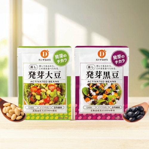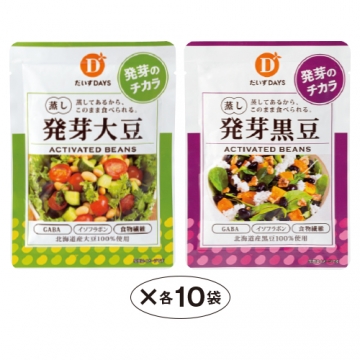 | 内容 | ●蒸し発芽大豆10袋(1袋100g)・蒸し発芽黒豆10袋(1袋70g) |