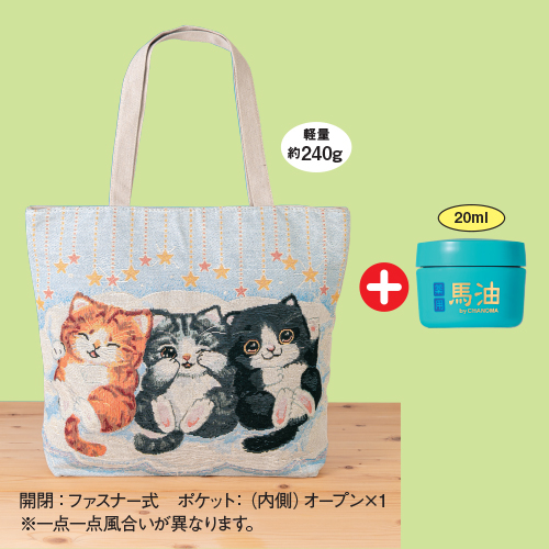 | 内容 | ●薬用馬油20ml/医薬部外品 ●バッグ1個(袋部分:約タテ40×ヨコ<上部>46・<下部>35×マチ9cm/綿・ポリエステル) |